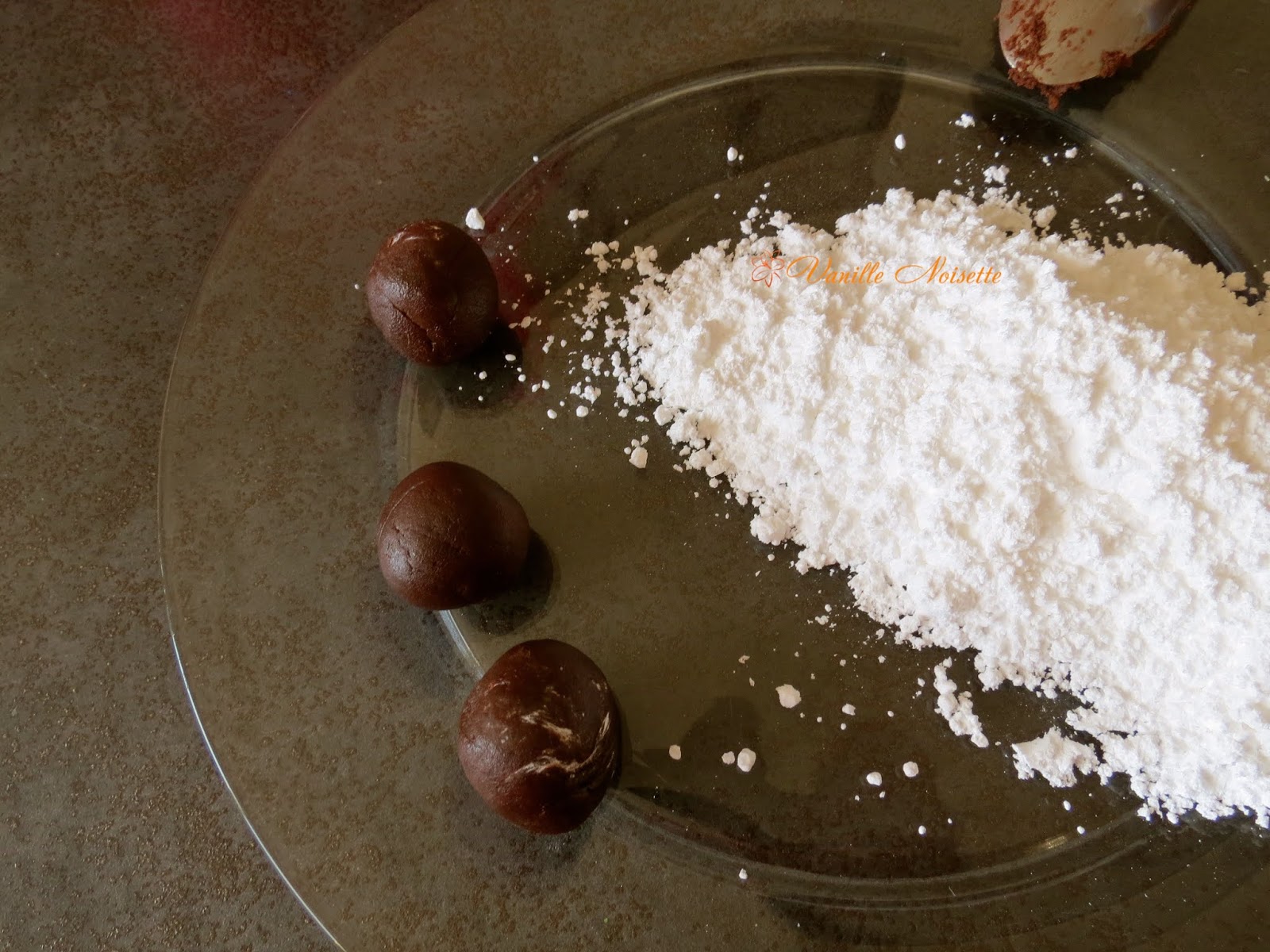 Sortez votre bol, votre pâte a bien durci, prenez des bouts de pâte et formez des boules que vous roulerez ensuite dans le sucre glace
